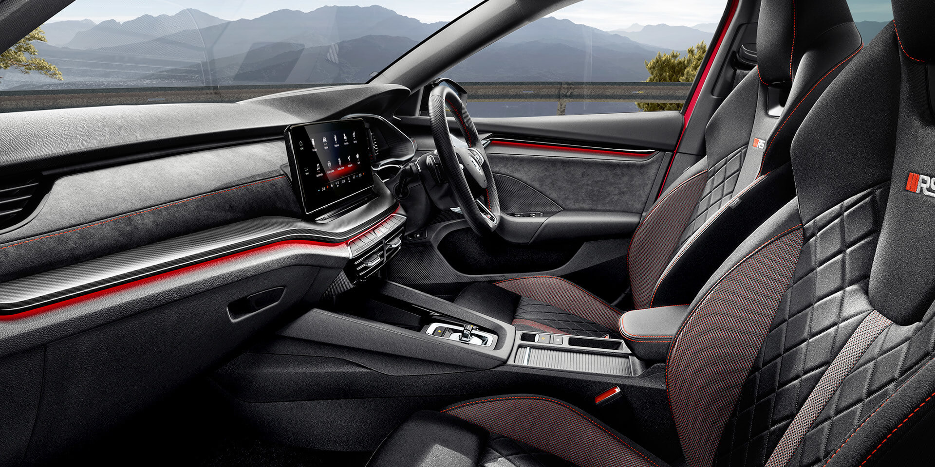 The RS interior is equipped with a multifunctional sports steering wheel, front sports seats with red stitching and aluminum pedal covers, complemented by an Alcantara® padded dashboard and carbon décor.