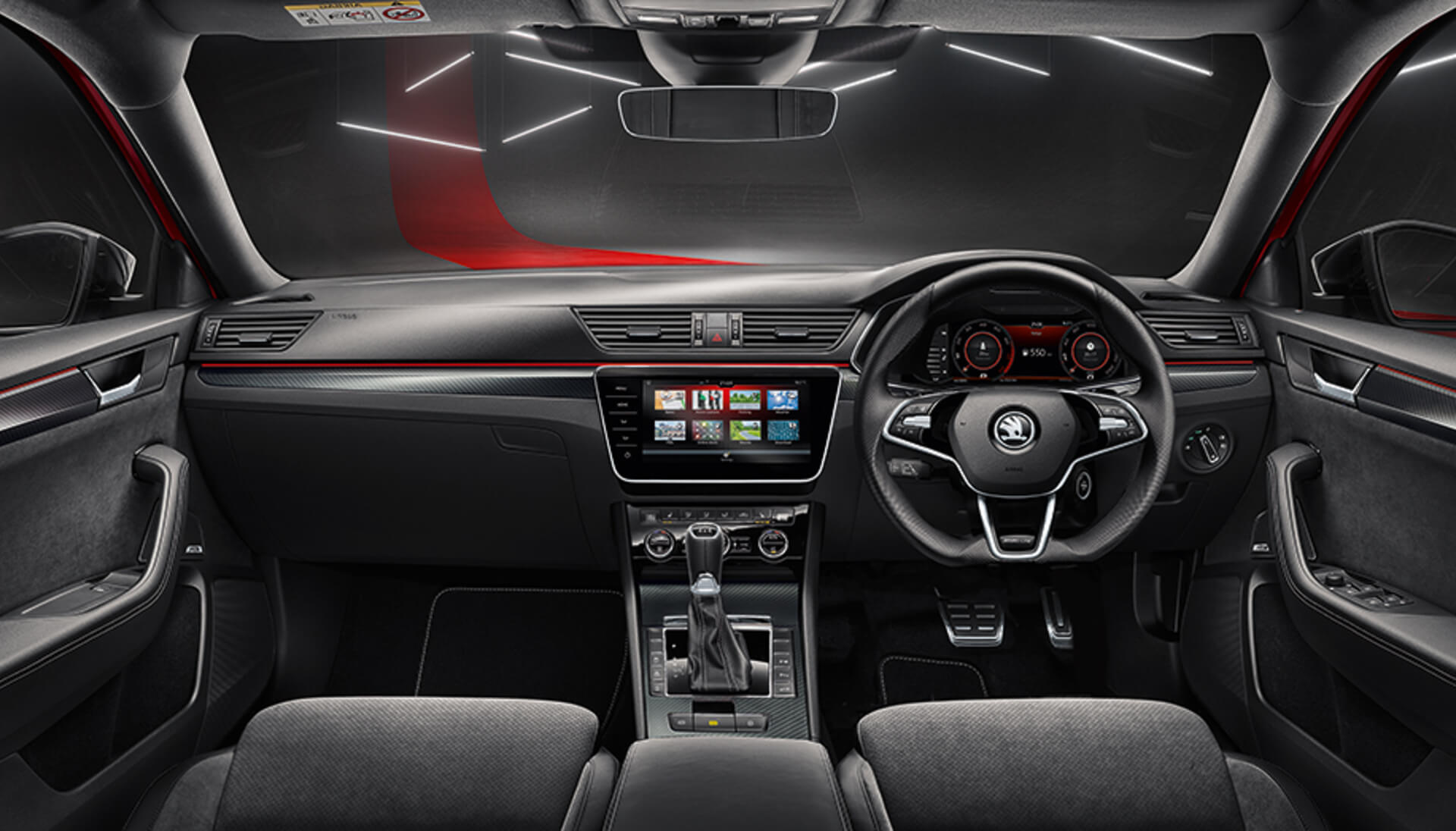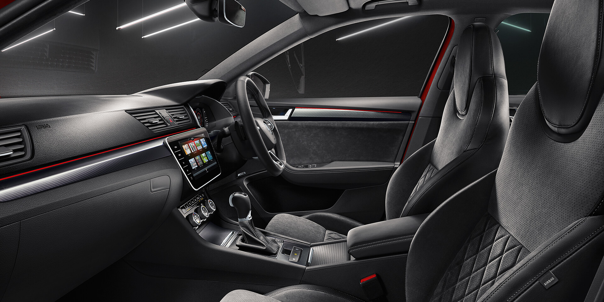 It shouldn’t take you long to get comfortable with the sports style interior. Settle into Alcantara® leather-appointed sports seat upholstery in black°, featured as standard across the SUPERB range. -