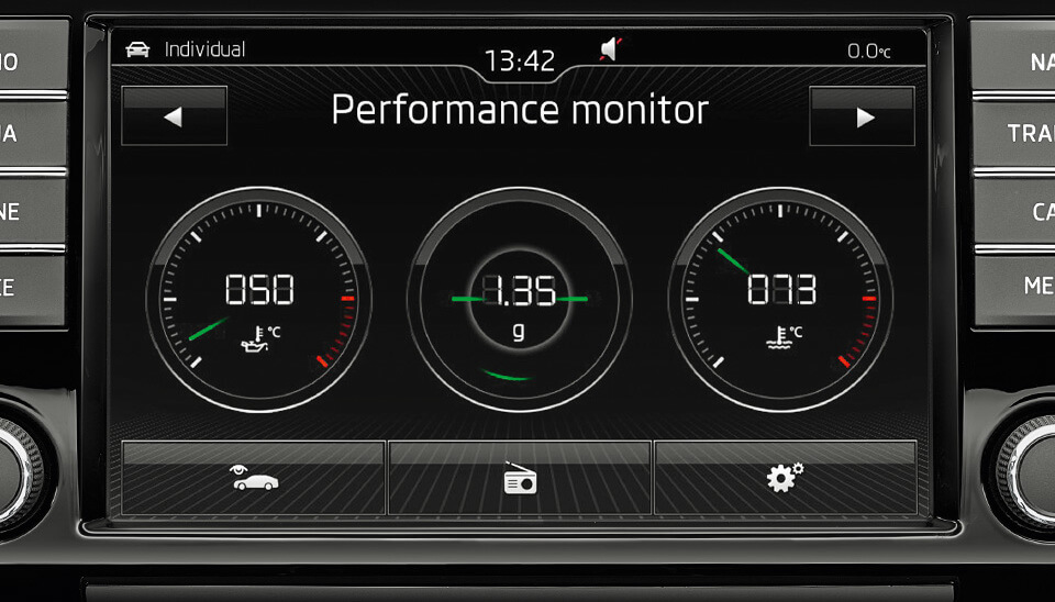 The SUPERB SPORTLINE Wagon has got your measure. Featured on the infotainment display, the Performance Monitor lets you fully enjoy the car’s sporting pedigree. Customise the monitor to show Bar Pressure, G-Force, kW’s, engine temperature, oil temperature, and lap times.