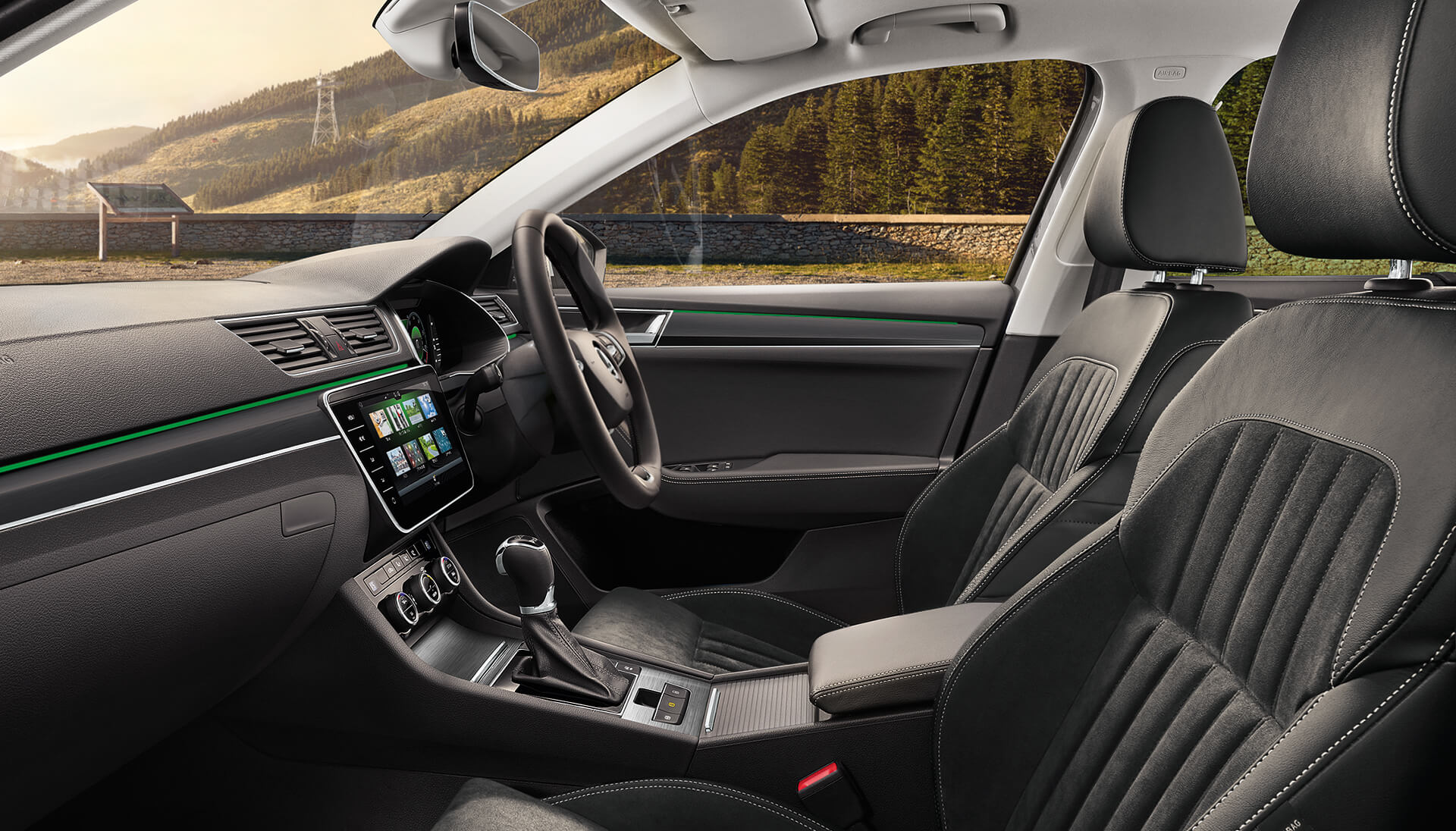 Inside the SUPERB Style you will feel right at home. Settle into Alcantara® and leather-appointed upholstery° in black, featured as standard across the SUPERB range.