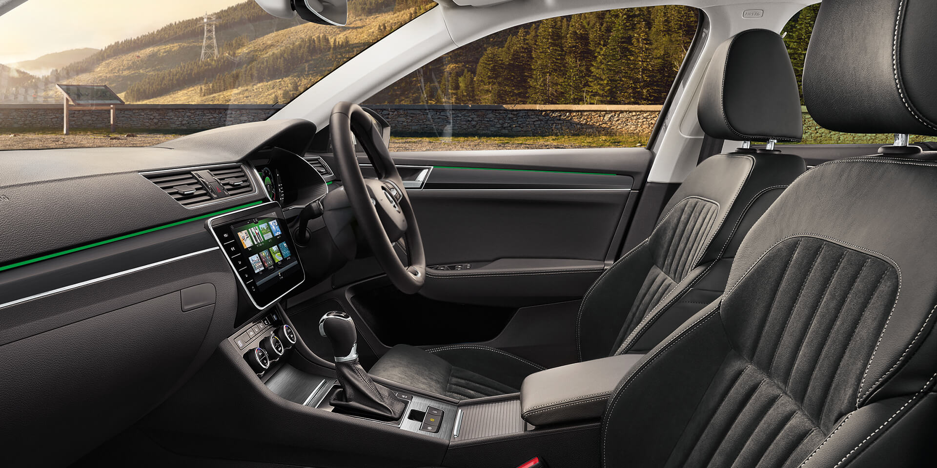 Inside the SUPERB Style you will feel right at home. Settle into Alcantara® and leather-appointed upholstery° in black, featured as standard across the SUPERB range.